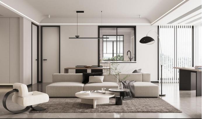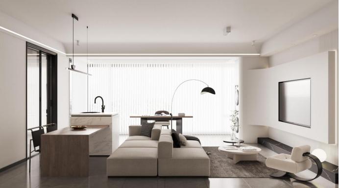客厅大面积的留白,局部点缀少量的色彩,以极简的形式让整个空间更加精致且富有细节感。多单元组合沙发,柔化空间线条感,又为空间增添了几分惬意。