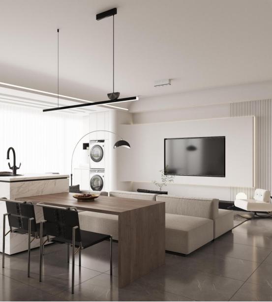 用沙发作为软隔断,在另一边设置了西厨水吧,白色暗纹水磨石台面配上线条感的吊灯,使得餐厅简洁大方,细腿餐椅将用餐空间提升了时尚现代感,平时招待朋友聚会更加的惬意舒适。