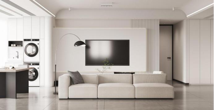 客厅大面积的收纳设计实用又美观,白色的储物柜与空间色彩统一,冷静典雅又不失情调。